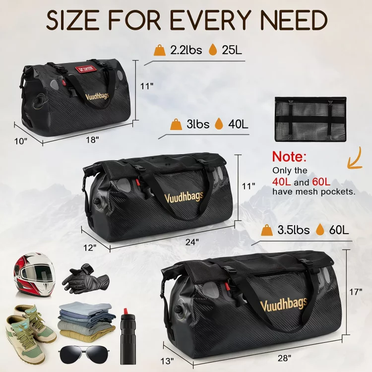 ENHANCED FUNCTIONALITY: Our motorcycle dry bag comes with a large external mesh pocket with a zipper, ideal for storing wet clothes, shoes, towels, and gear. Additionally, we’ve included Velcro, allowing you to easily customize and attach the morale patches of your choice. This waterproof duffel bag is crafted for maximum practicality, addressing all your outdoor needs.